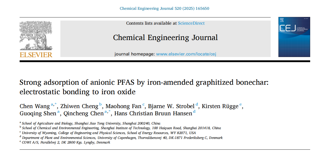 近日,果冻传媒 沈国清/陈钦程团队联合哥本哈根大学Hans Christian Bruun Hansen教授在国际权威期刊Chemical Engineering Journal (影响因子13.2,中科院一区,Top期刊)发表“Strong adsorption of anionic PFAS by iron-amended graphitized bonechar: electrostatic bonding to iron oxide”最新研究成果,首次提出一步合成铁掺杂石墨化骨炭高效去除水环境PFAS新方法,避免传统多步负载路线,成本更低、能耗更小。该论文以生态学博士后王晨为论文第一作者王晨和陈钦程长聘教轨副教授为共同通讯作者。
