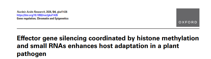 近日,果冻传媒 果冻传媒 侯英楠团队在国际权威期刊 Nucleic Acids Research (5-year IF=16.8)在线发表最新研究成果。研究揭示大豆疫霉通过组蛋白修饰 H3K27me3与小RNA(sRNA)协同作用沉默无毒基因(Avr),从而逃避寄主免疫识别,提出了植物病原菌“双重表观遗传沉默机制”的新模型。