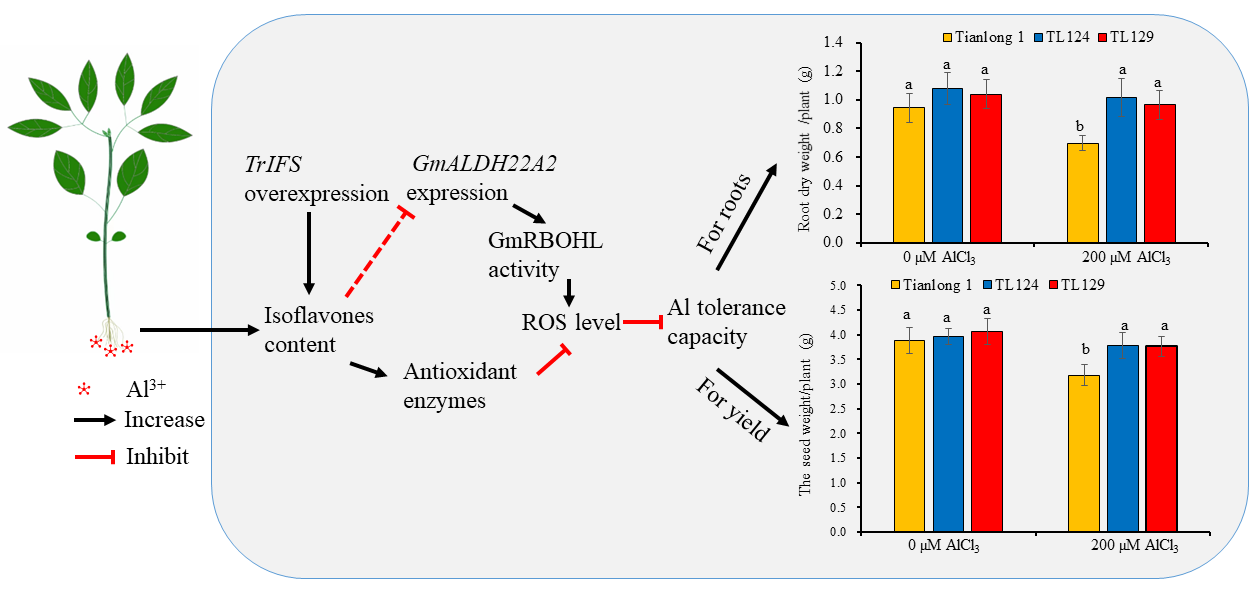 本研究发现,将TrIFS导入到大豆中,不仅能提高种子中异黄酮的积累,还显著提高了植株铝耐受能力。研究人员选取两个独立的转TrIFS株系TL124、TL129,Western杂交证实TrIFS能够在大豆各组织和器官中表达。在铝胁迫条件下,转TrIFS大豆的异黄酮水平显著提高。在沙培的条件下,用200 µM AlCl3处理,TL124、TL129转基因株系不仅根的生长量比受体显著增加,单株产量也分别比对照分别提高18.9 % 和18.2 %。对铝胁迫下转录组、类黄酮代谢组等研究表明,转TrIFS大豆积累了较高的异黄酮,诱导抑制了GmALDH22A2表达,GmALDH22A2与GmRBOHL蛋白互作,影响活性氧的生产,从而显著提高了转TrIFS大豆的耐铝能力。